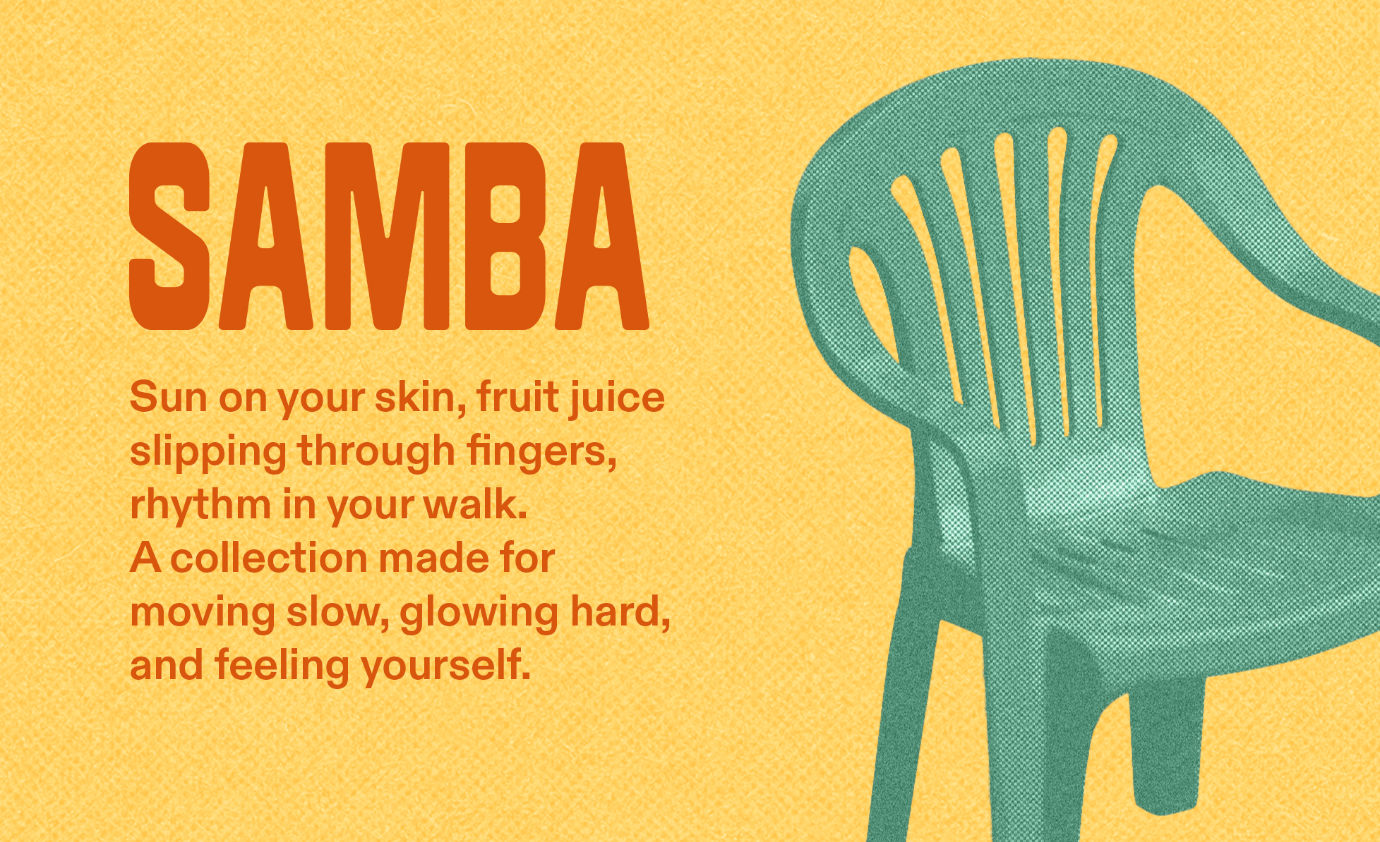 Person with megaphone, tropical fruits, and 'SAMBA' text on teal background.
