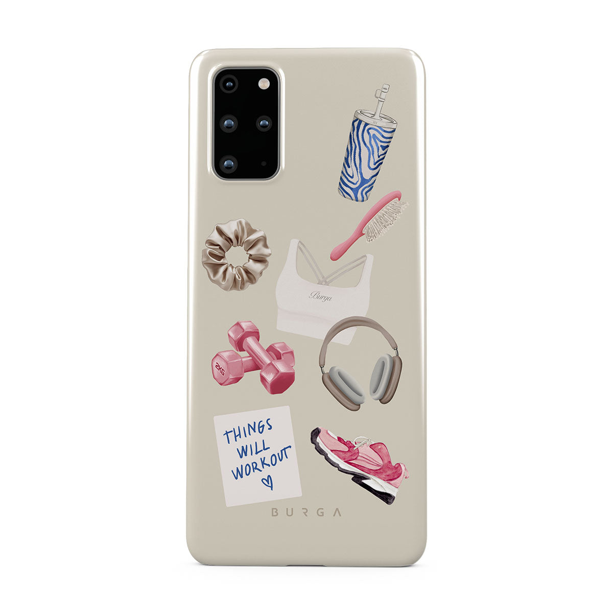 This design features: dumbbells, headphones, tumbler, hairbrush, pink trainers, sports bra, crunchie, "Things Will Work Out" sticky note