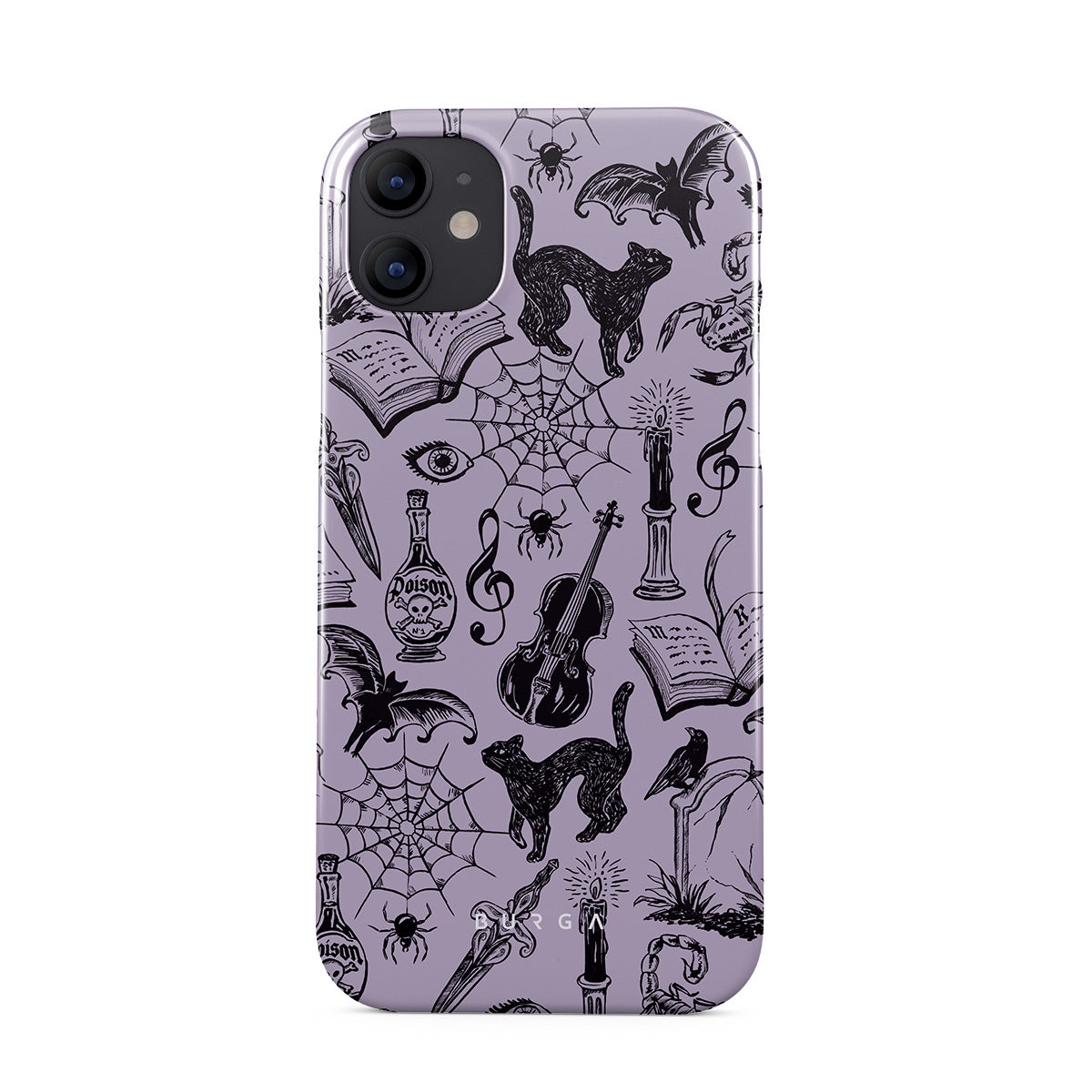 This design features: gothic doodles, mystical elements, spiders, spiderweb, cat, violin, eye, candle, dagger, book, bat, crow, scorpion