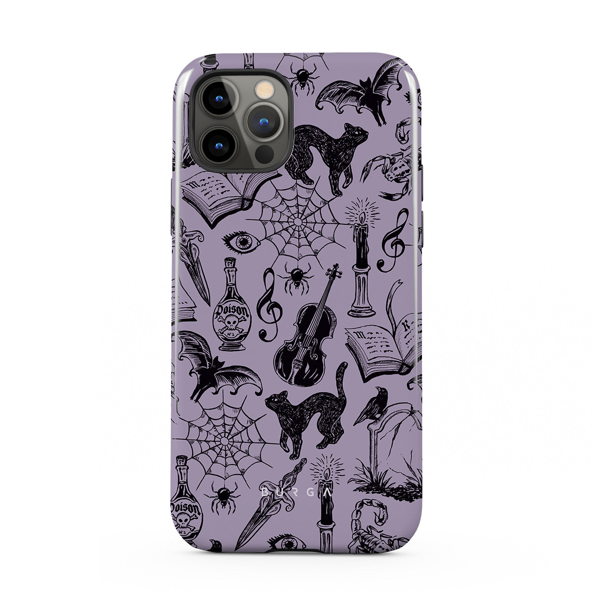 This design features: gothic doodles, mystical elements, spiders, spiderweb, cat, violin, eye, candle, dagger, book, bat, crow, scorpion