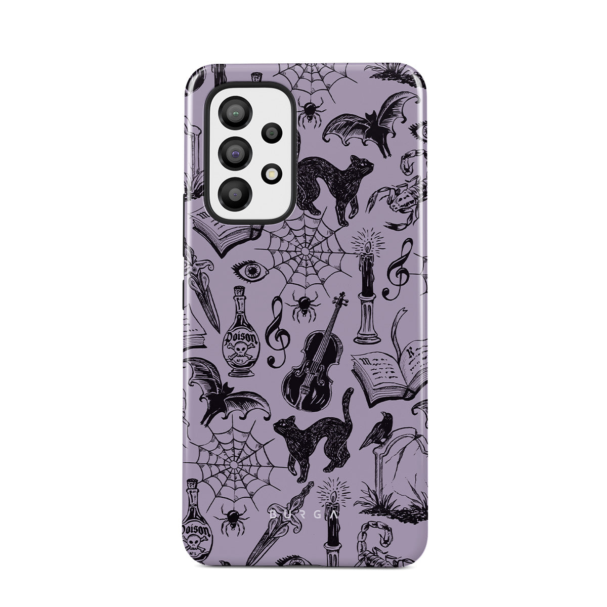 This design features: gothic doodles, mystical elements, spiders, spiderweb, cat, violin, eye, candle, dagger, book, bat, crow, scorpion