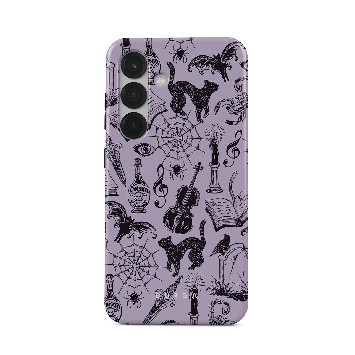 This design features: gothic doodles, mystical elements, spiders, spiderweb, cat, violin, eye, candle, dagger, book, bat, crow, scorpion