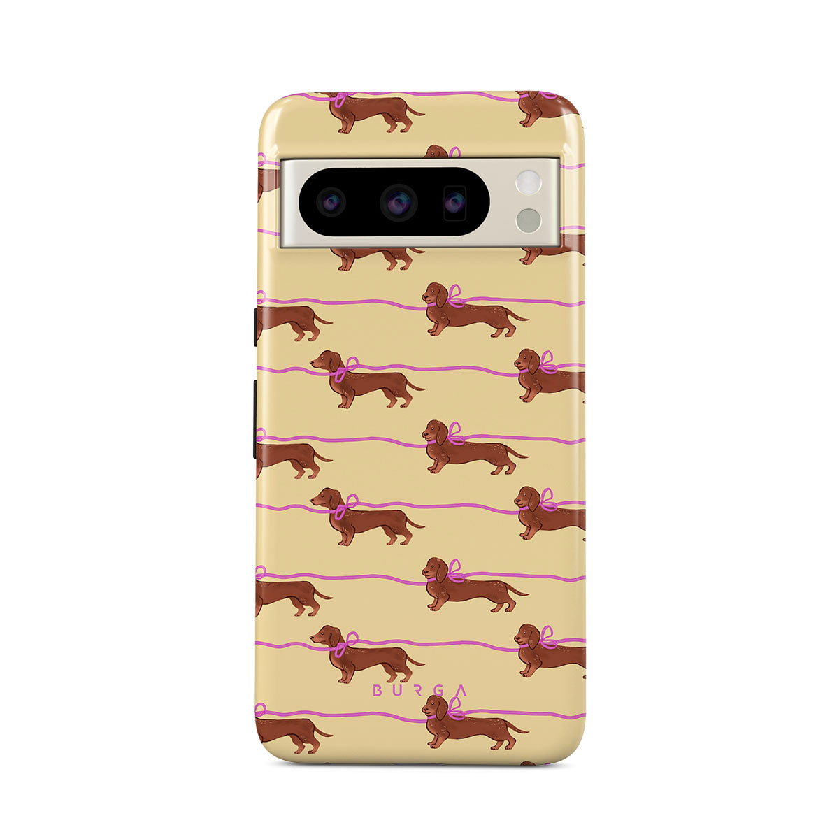 This Google Pixel 8 Pro phone case design doesn’t believe in time, only vibes. It features sassy sausage dogs with bows who, like you, are running 15 minutes behind—and blaming Mercury.