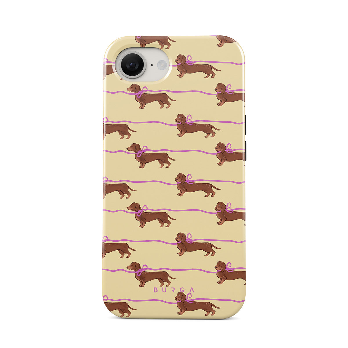 This iPhone 16e phone case design doesn’t believe in time, only vibes. It features sassy sausage dogs with bows who, like you, are running 15 minutes behind—and blaming Mercury.