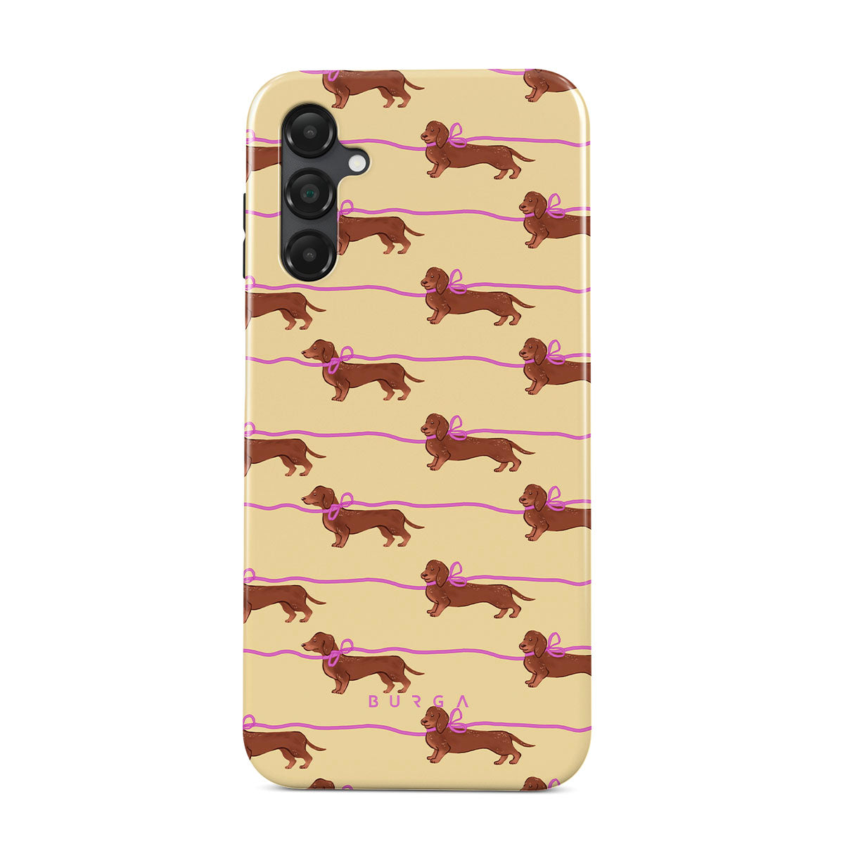 This Samsung Galaxy A14 5G phone case design doesn’t believe in time, only vibes. It features sassy sausage dogs with bows who, like you, are running 15 minutes behind—and blaming Mercury.