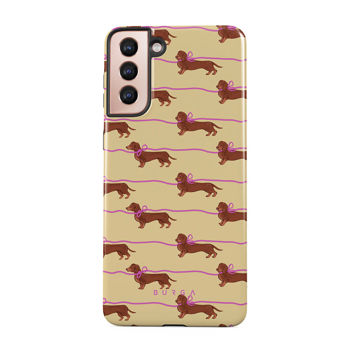This Samsung Galaxy S21 Plus phone case design doesn’t believe in time, only vibes. It features sassy sausage dogs with bows who, like you, are running 15 minutes behind—and blaming Mercury.