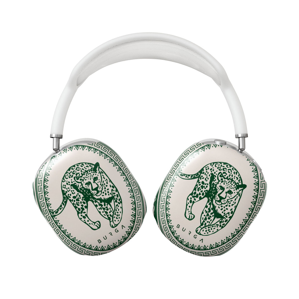 Our Antique Apple AirPods Max case cover designa nude canvas kissed by refined green contours, painting an eternal saga of elegance. Enthroned at its center is a regal leopard embraced by a tender floral caress. A nod to timeless opulence, this design captures the essence of vintage prestige.
