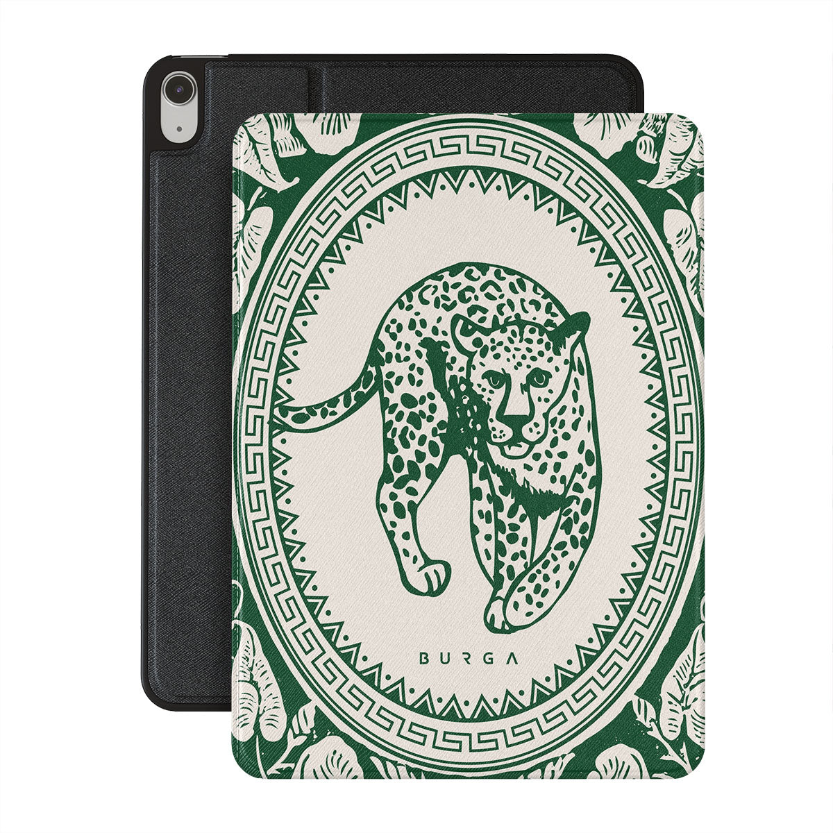 Our Antique iPad Air 11 (7th/6th Gen) folio case designa nude canvas kissed by refined green contours, painting an eternal saga of elegance. Enthroned at its center is a regal leopard embraced by a tender floral caress. A nod to timeless opulence, this design captures the essence of vintage prestige.