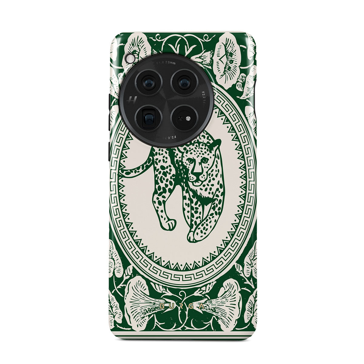 Our Antique OnePlus 12 phone case design—a nude canvas kissed by refined green contours, painting an eternal saga of elegance. Enthroned at its center is a regal leopard embraced by a tender floral caress. A nod to timeless opulence, this design captures the essence of vintage prestige.