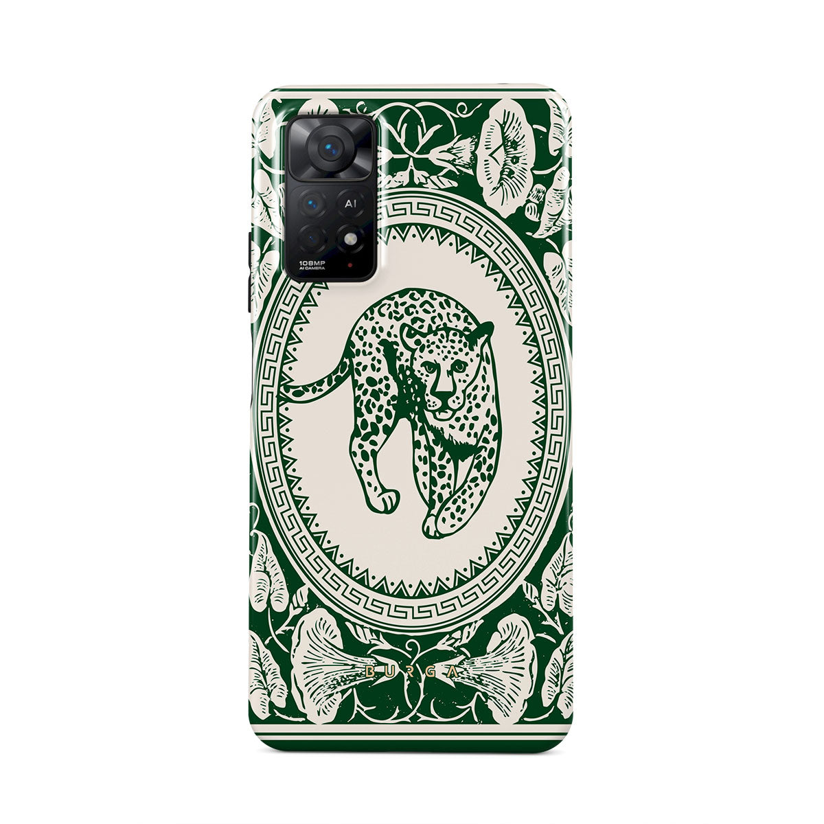 Our Antique Xiaomi Redmi Note 11 Pro phone case design—a nude canvas kissed by refined green contours, painting an eternal saga of elegance. Enthroned at its center is a regal leopard embraced by a tender floral caress. A nod to timeless opulence, this design captures the essence of vintage prestige.