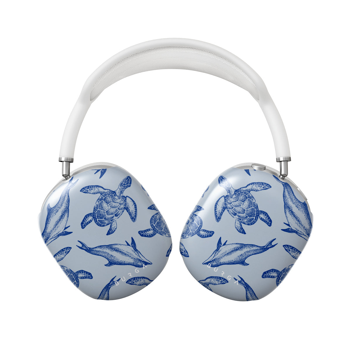 A beautiful design featuring lively turtles and dolphins playfully dancing in serene light blue water. Dive into the ocean's rhythm with our Aquatic Dance Apple AirPods Max case cover.
