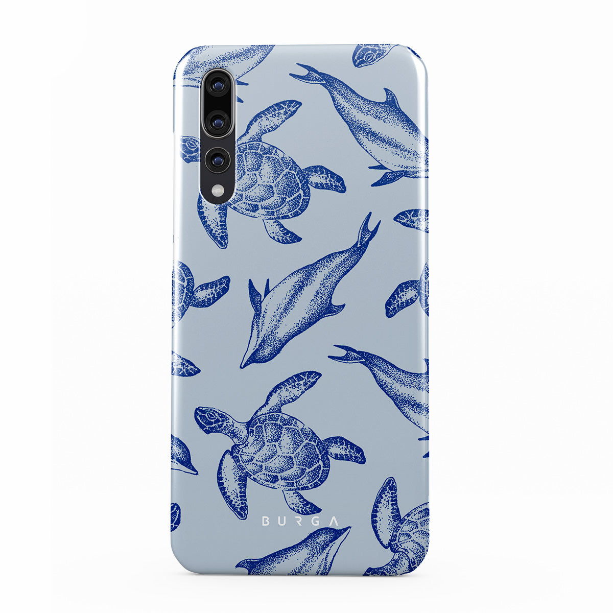 A beautiful design featuring lively turtles and dolphins playfully dancing in serene light blue water. Dive into the ocean's rhythm with our Aquatic Dance Huawei P20 case.