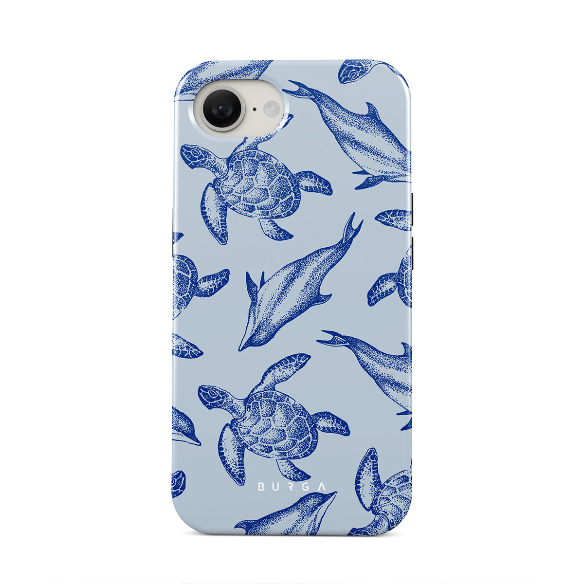 A beautiful design featuring lively turtles and dolphins playfully dancing in serene light blue water. Dive into the ocean's rhythm with our Aquatic Dance iPhone 16e case.