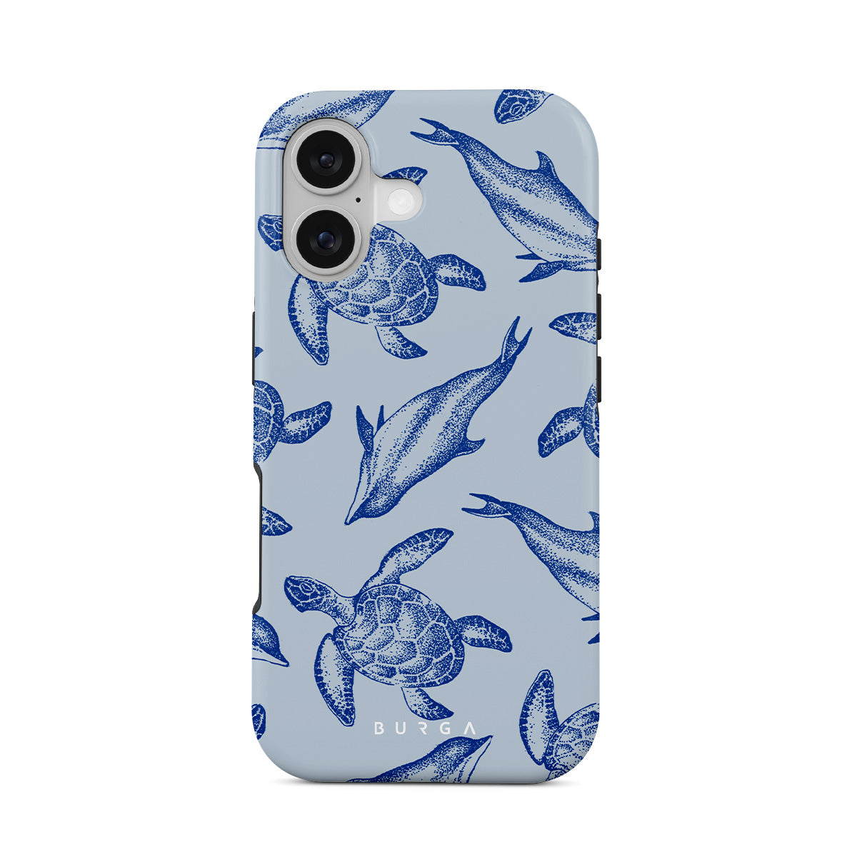 A beautiful design featuring lively turtles and dolphins playfully dancing in serene light blue water. Dive into the ocean's rhythm with our Aquatic Dance iPhone 17 case.