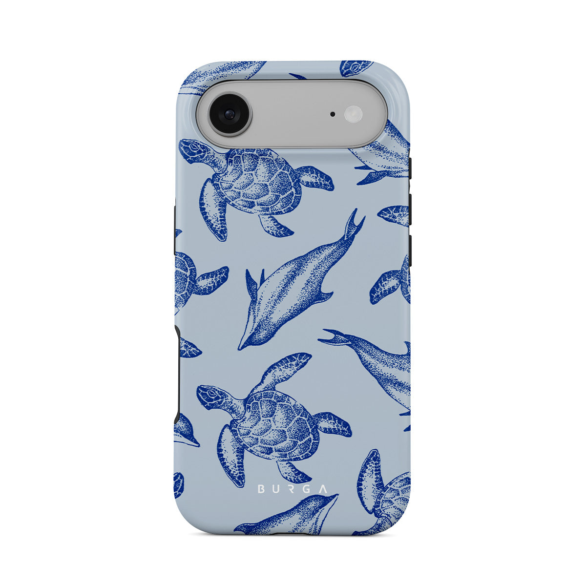 A beautiful design featuring lively turtles and dolphins playfully dancing in serene light blue water. Dive into the ocean's rhythm with our Aquatic Dance iPhone Air case.