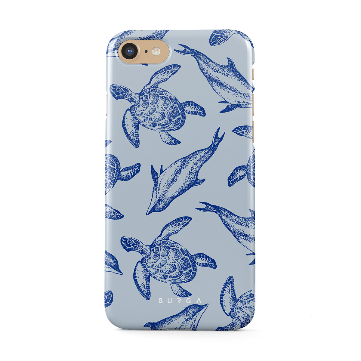A beautiful design featuring lively turtles and dolphins playfully dancing in serene light blue water. Dive into the ocean's rhythm with our Aquatic Dance iPhone SE (2020) case.