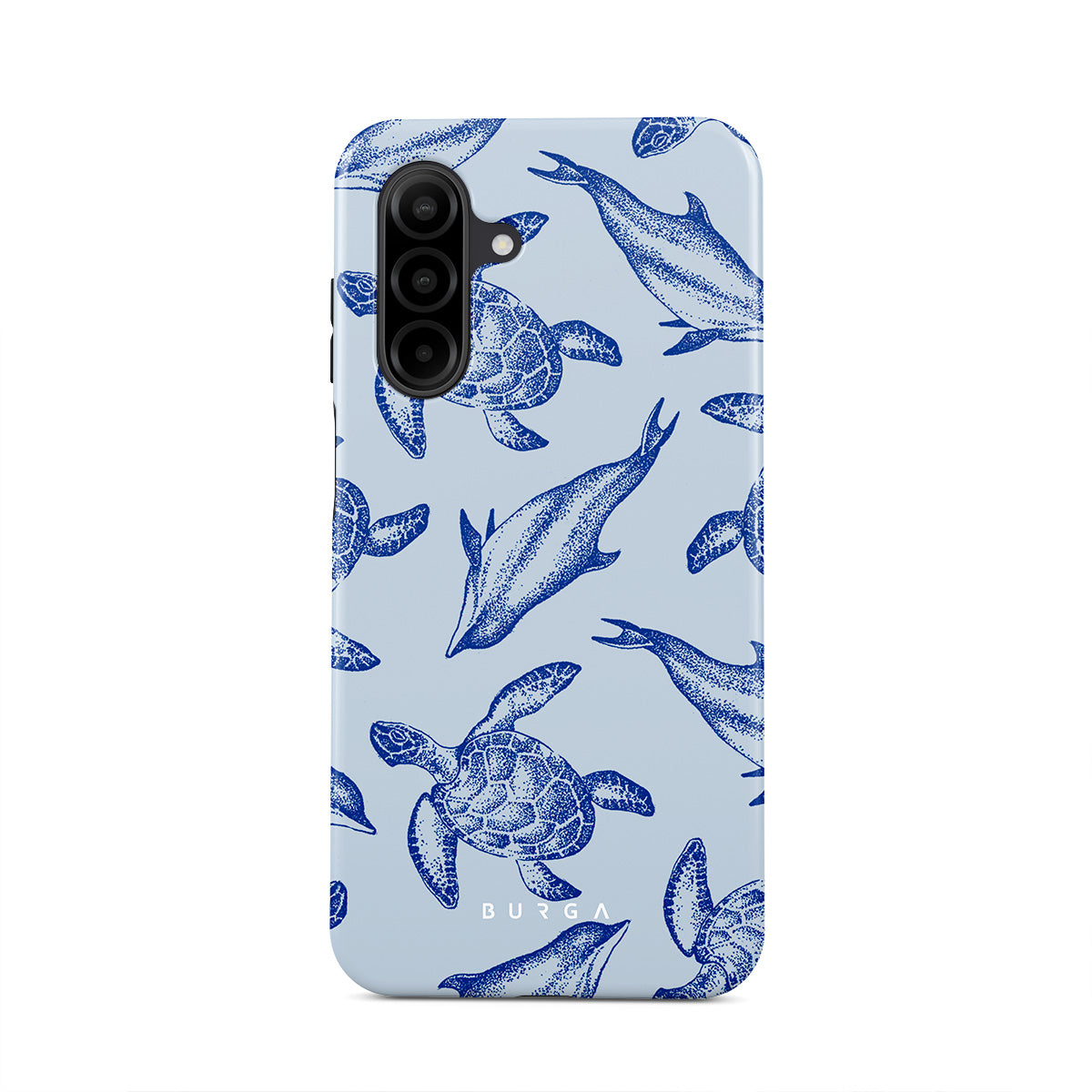 A beautiful design featuring lively turtles and dolphins playfully dancing in serene light blue water. Dive into the ocean's rhythm with our Aquatic Dance Samsung Galaxy A26 5G case.