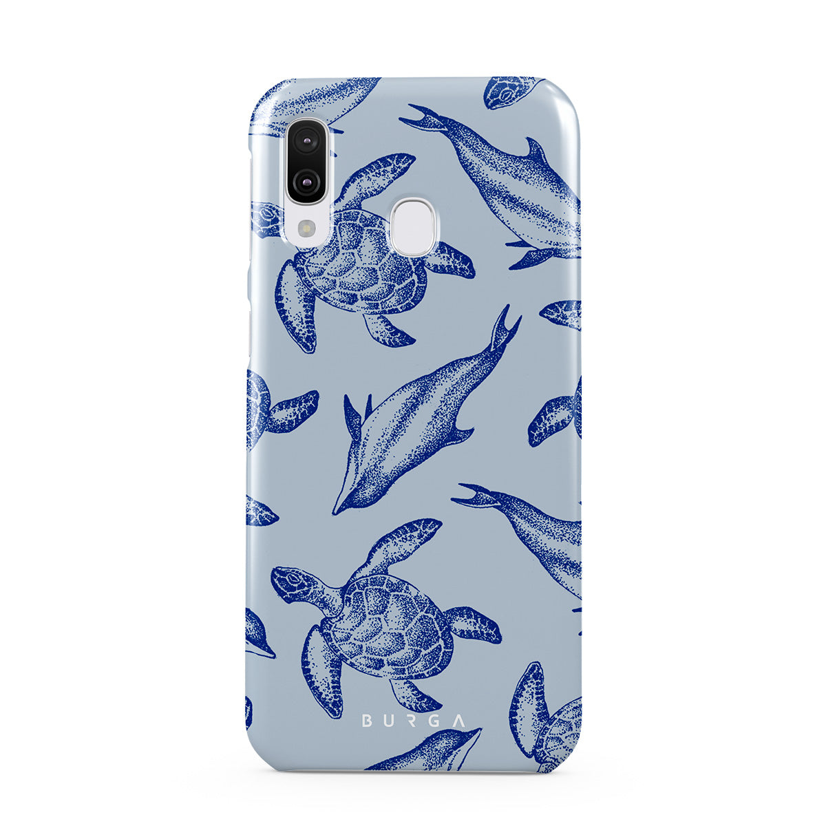 A beautiful design featuring lively turtles and dolphins playfully dancing in serene light blue water. Dive into the ocean's rhythm with our Aquatic Dance Samsung Galaxy A40 case.