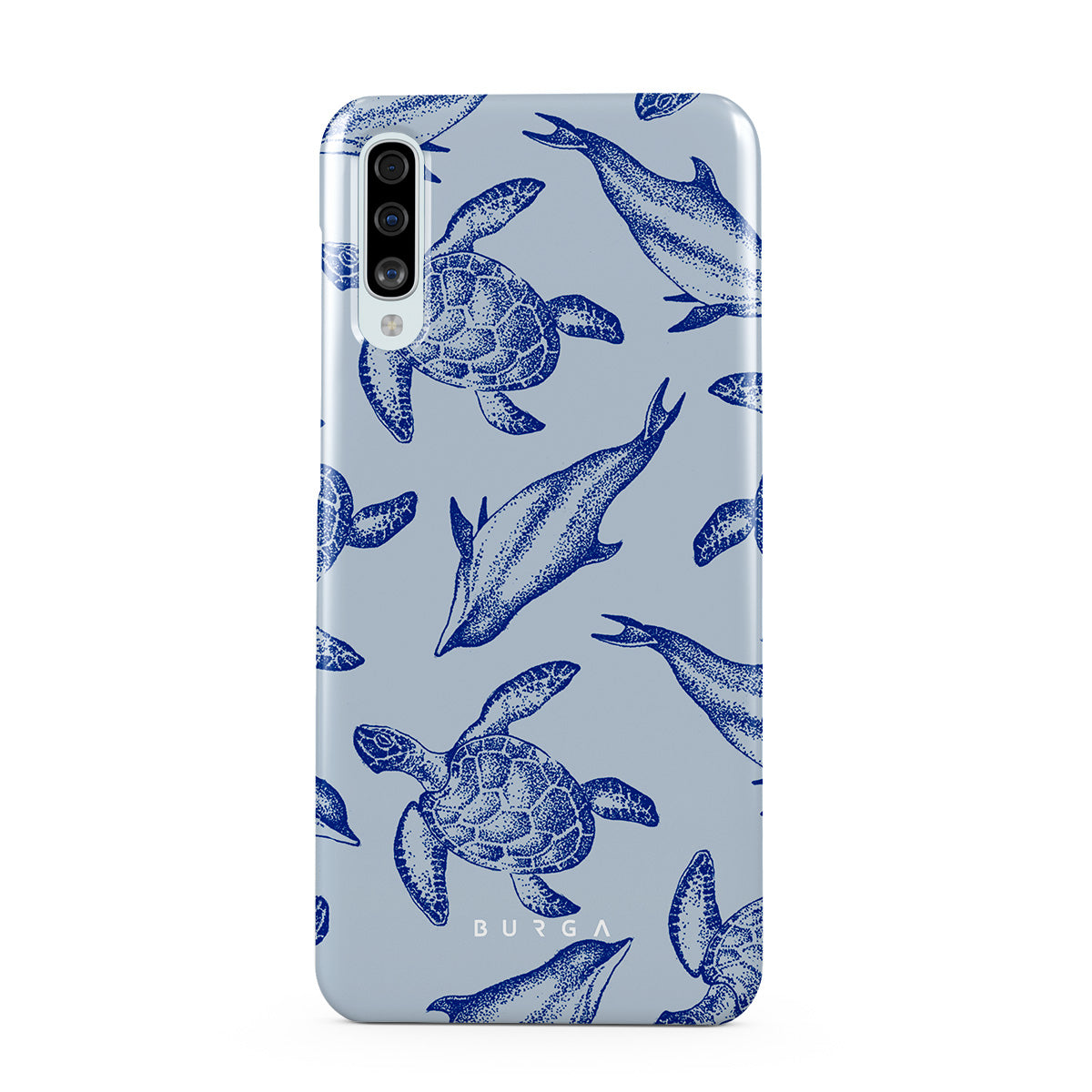 A beautiful design featuring lively turtles and dolphins playfully dancing in serene light blue water. Dive into the ocean's rhythm with our Aquatic Dance Samsung Galaxy A50 case.