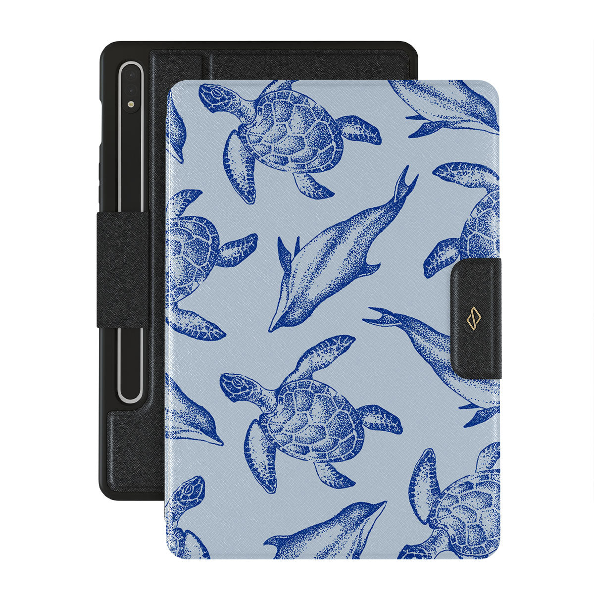 A beautiful design featuring lively turtles and dolphins playfully dancing in serene light blue water. Dive into the ocean's rhythm with our Aquatic Dance Samsung Galaxy Tab S9+ folio case.
