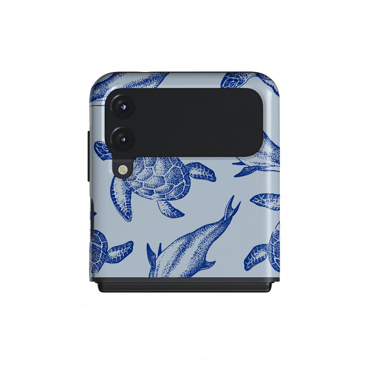 A beautiful design featuring lively turtles and dolphins playfully dancing in serene light blue water. Dive into the ocean's rhythm with our Aquatic Dance Samsung Galaxy Z Flip 3 case.
