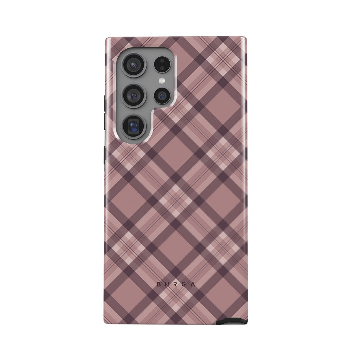 Made for those who hustle hard and look sharp. Our ASAP Samsung Galaxy S24 Ultra phone case design features a sleek rosé-gray background with diagonal plaid in soft grey and deep pink—mixing modern flair with understated elegance. For the pros who know that style and speed go hand-in-hand.