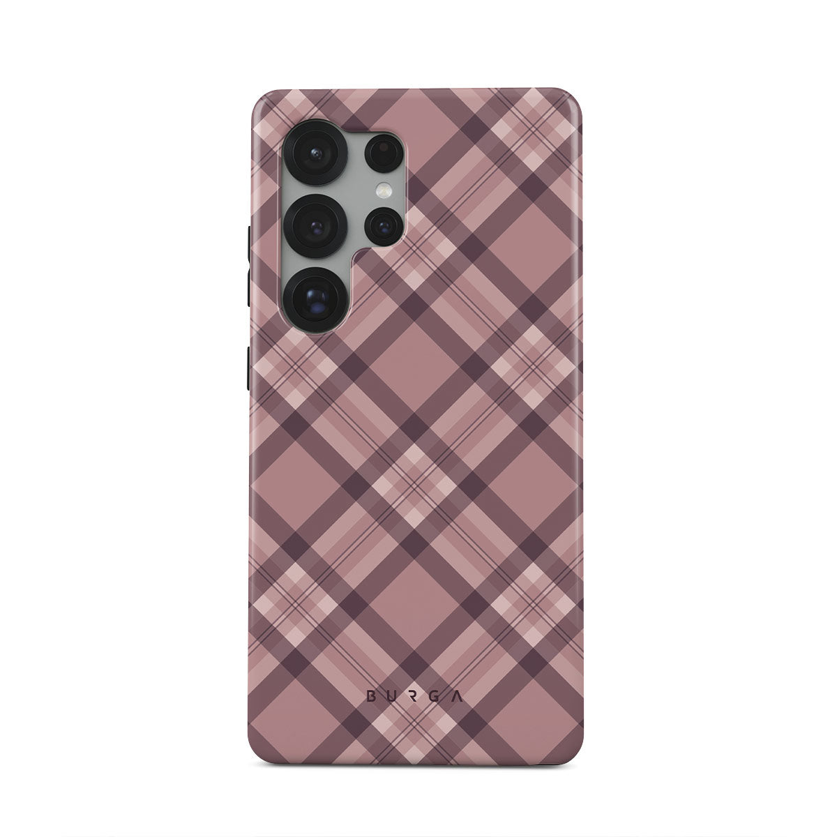 Made for those who hustle hard and look sharp. Our ASAP Samsung Galaxy S25 Ultra phone case design features a sleek rosé-gray background with diagonal plaid in soft grey and deep pink—mixing modern flair with understated elegance. For the pros who know that style and speed go hand-in-hand.