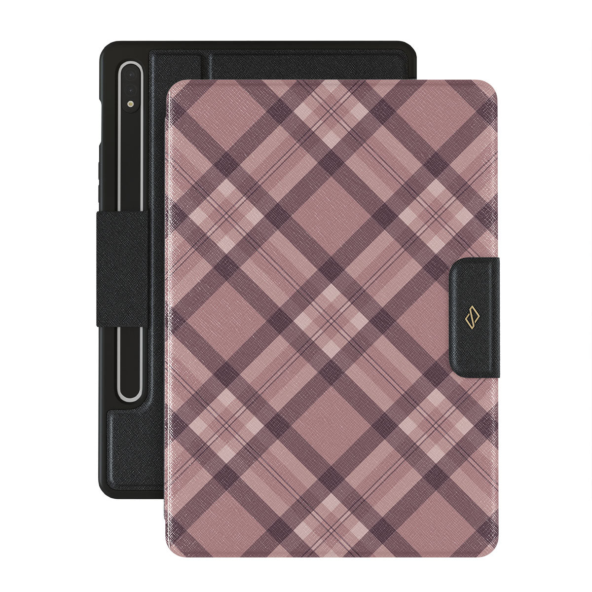 Made for those who hustle hard and look sharp. Our ASAP Samsung Galaxy Tab S9 FE folio case design features a sleek rosé-gray background with diagonal plaid in soft grey and deep pink—mixing modern flair with understated elegance. For the pros who know that style and speed go hand-in-hand.