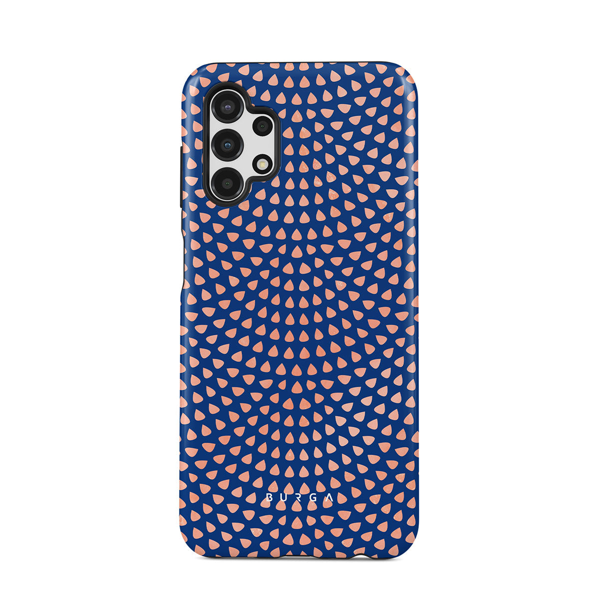 Rose gold teardrops meet a deep shade of blue in our Azure Waters Samsung Galaxy A13 4G phone case and create the duo worth taking with you every evening out. Add a touch of strictness with the symmetrical teardrops pattern paving the way and keeping your phone out of harm's way with the case that is as protective as it is beautiful.