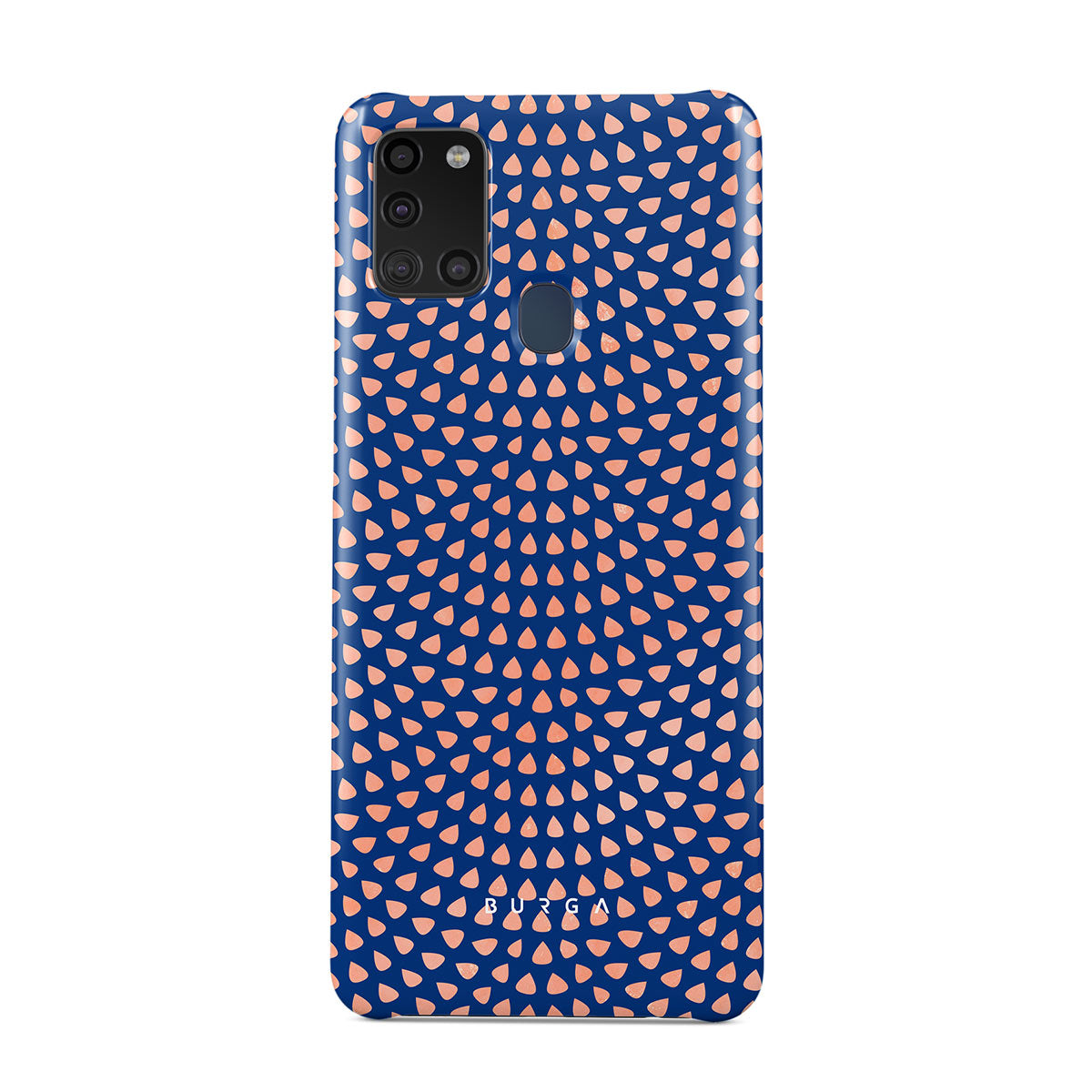 Rose gold teardrops meet a deep shade of blue in our Azure Waters Samsung Galaxy A21s 4G phone case and create the duo worth taking with you every evening out. Add a touch of strictness with the symmetrical teardrops pattern paving the way and keeping your phone out of harm's way with the case that is as protective as it is beautiful.