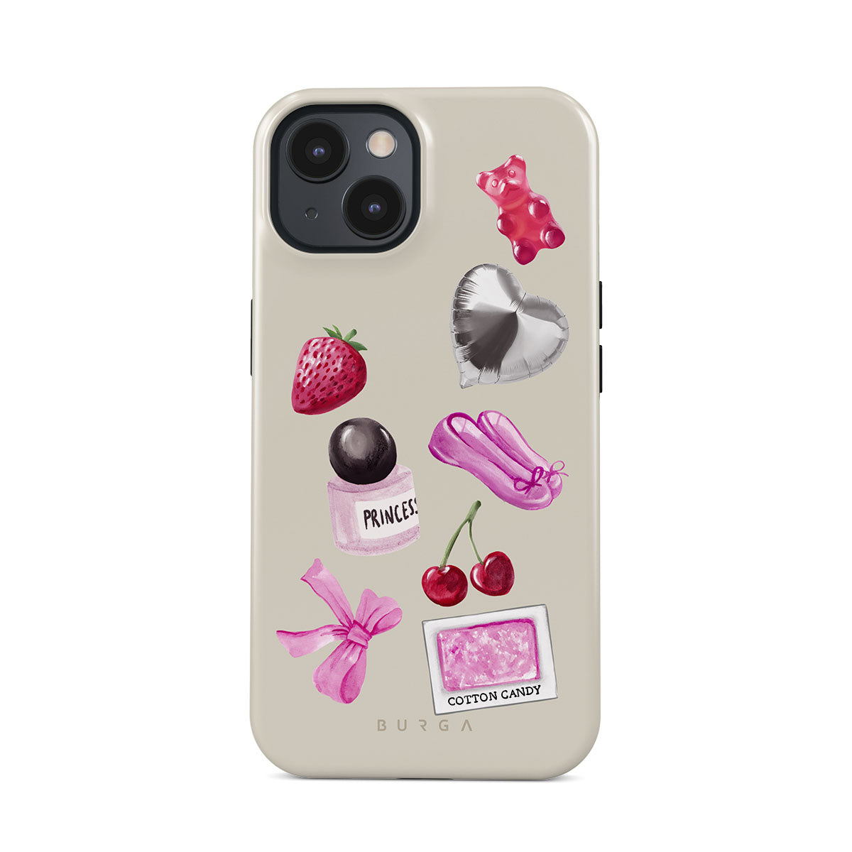 This design features: pink bow, heart-shaped silver balloon, perfume bottle, strawberry, cherries, pink ballet slippers, cotton candy sticker, pink gummy bear