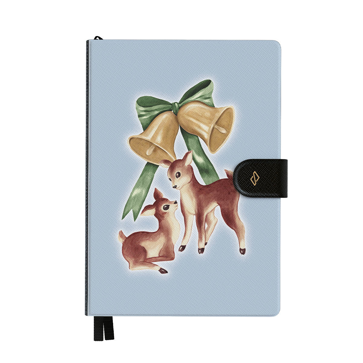 This design features: vintage reindeer, Christmas bells, golden bells, retro reindeer illustration, baby deer, light blue background