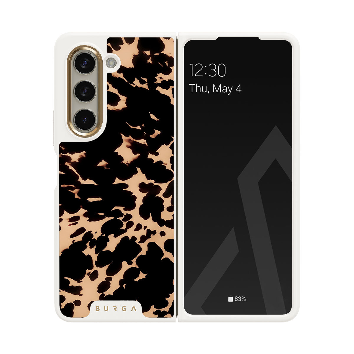 Bold and fearless, just like your return to the office. Dark coffee shapes stretch across a soft beige-yellow canvas, blending wild energy with refined style. Our Betty Samsung Galaxy Z Fold 5 phone case design is perfect for making a statement as you return to the spotlight.