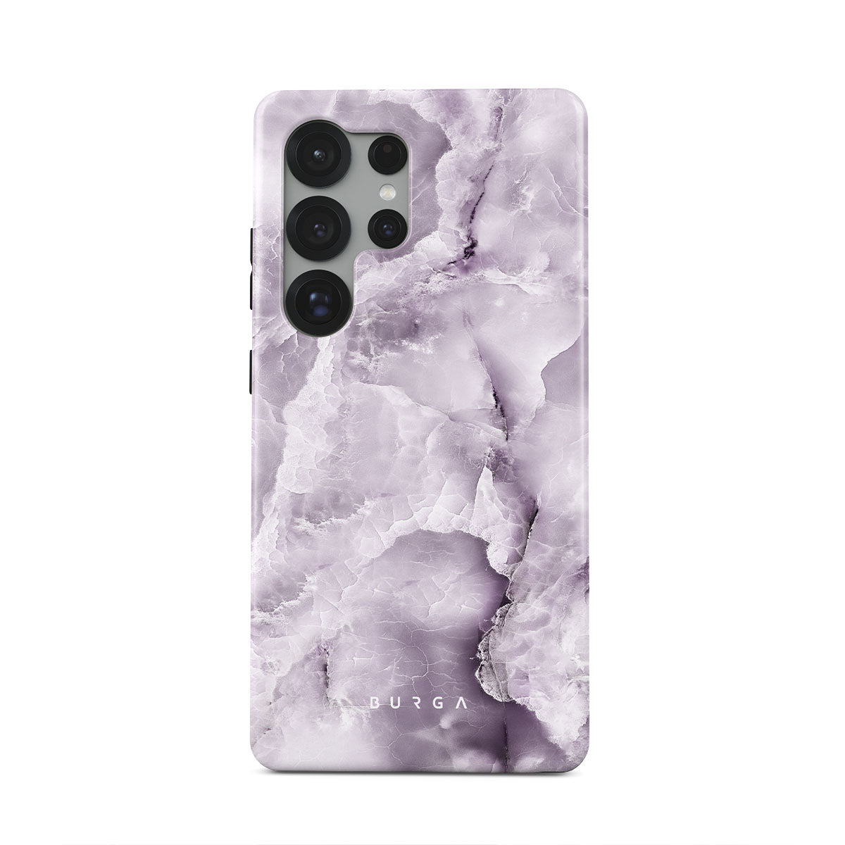 The gray violet-colored Black Currant Samsung Galaxy S25 Ultra phone case showcases a soft marble design that will add a touch of luxury to your style. The color itself represents the future and dreams, yet the nature of it offers a calming effect. Keep a piece of serenity in your hands.