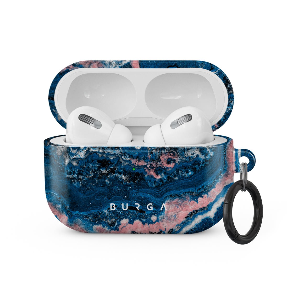 Electric indigo blue meets white and pastel pink swirls in a unique marble pattern of our Blue Lagoon Apple Airpods Pro case cover. The design will add a modern feel to your wardrobe while offering durable protection from falls and scratches for your AirPods case. Our case fits perfectly snug around Apple Airpods Pro . “Like a glove!” one might say. And it won’t disrupt the wireless charging capabilities of the newer model. There’s even an LED light indicator to prove it (don’t worry, wired charging still works, too). When fitted, the BURGA case will protect the delicate Apple Airpods Pro case beneath it from scratches, bumps, and drops while remaining scratch-free itself. Our signature design pattern prints are High Quality, and will never peel or fade away- thanks to our unique printing technology. And finally, a handy carabiner is there to make your life easier and more convenient: just snap it around your keys or belt loop and tackle the day head-on. Your music is right there by your side when you need it.