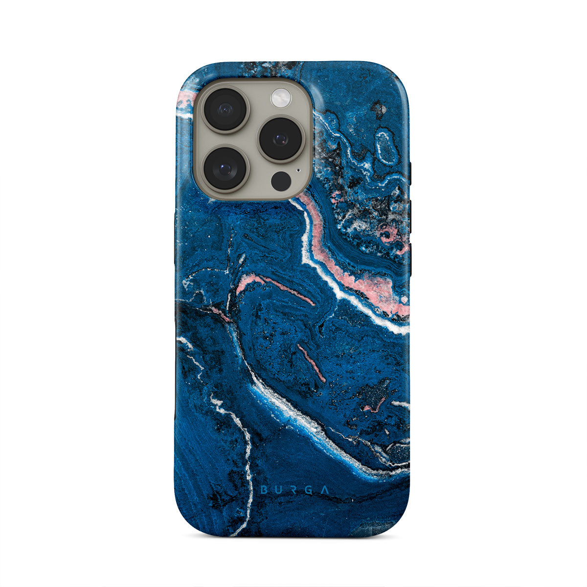 Electric indigo blue meets white, and pastel pink swirls in a unique marble pattern in our Blue Lagoon iPhone 16 Pro phone case. The modern take on a blue marble trend will look aesthetically pleasing on your device while offering durable protection from any falls.