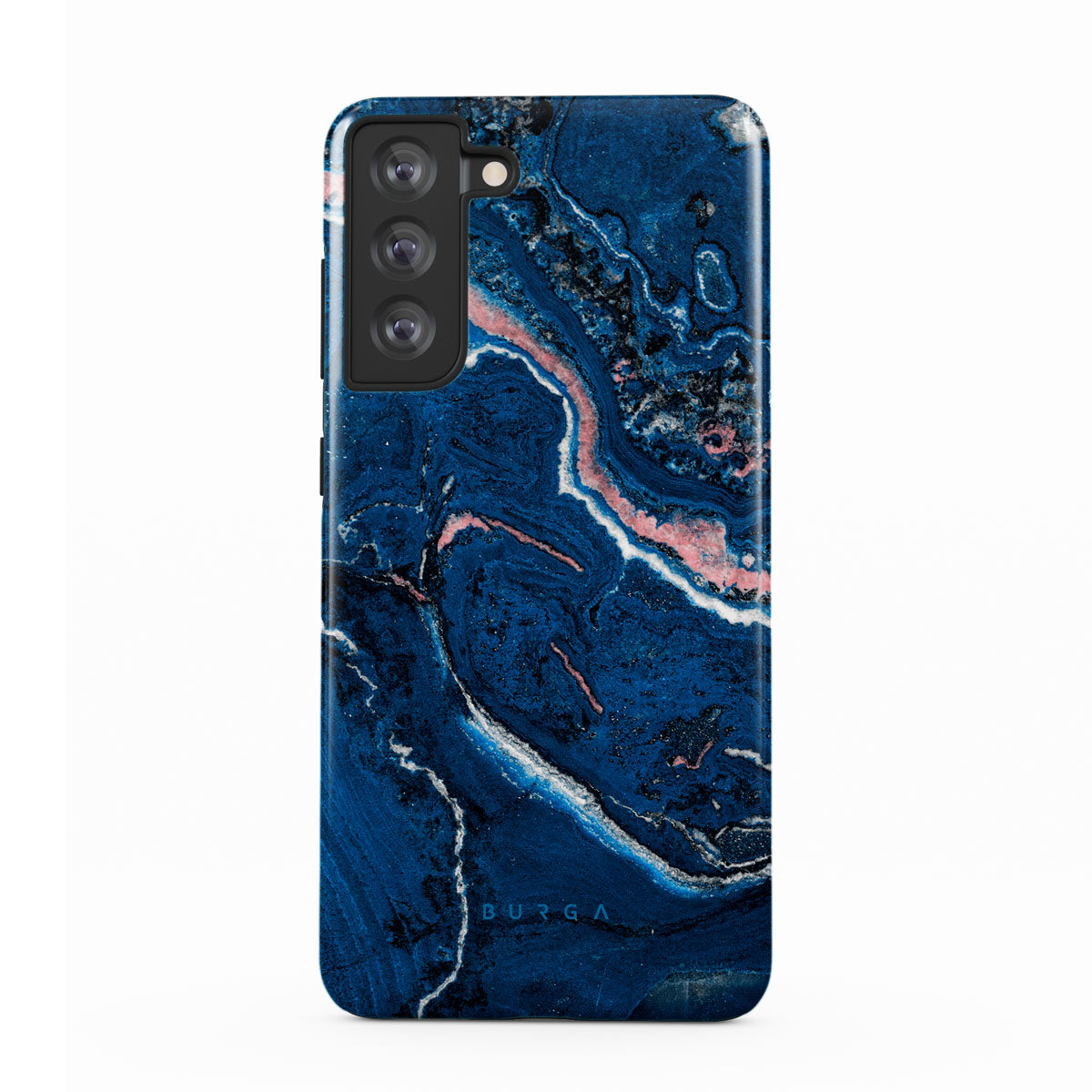 Electric indigo blue meets white, and pastel pink swirls in a unique marble pattern in our Blue Lagoon Samsung Galaxy S21 FE phone case. The modern take on a blue marble trend will look aesthetically pleasing on your device while offering durable protection from any falls.