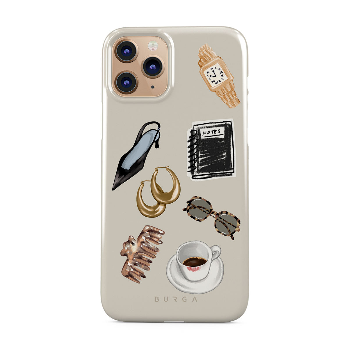 This design features: black high heel, gold hoop earrings, black notebook, coffee cup, tortoiseshell glasses, brown scrunchie, retro gold watch