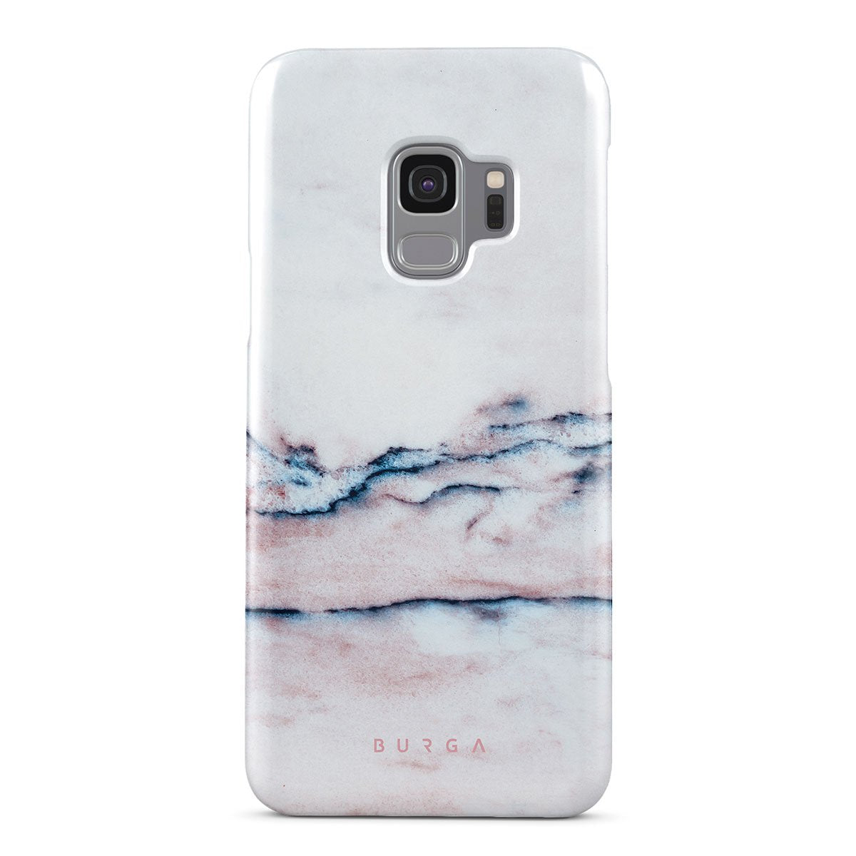 A pastel phone case is a must in every collection, and our soft Bubble Gum Samsung Galaxy S9 phone case is the one. The minimalistic design features a pink gradient with deep blue swirls in a marble pattern. Such a hard-shell case will provide heavy-duty protection while adding a touch of pastel to your collection