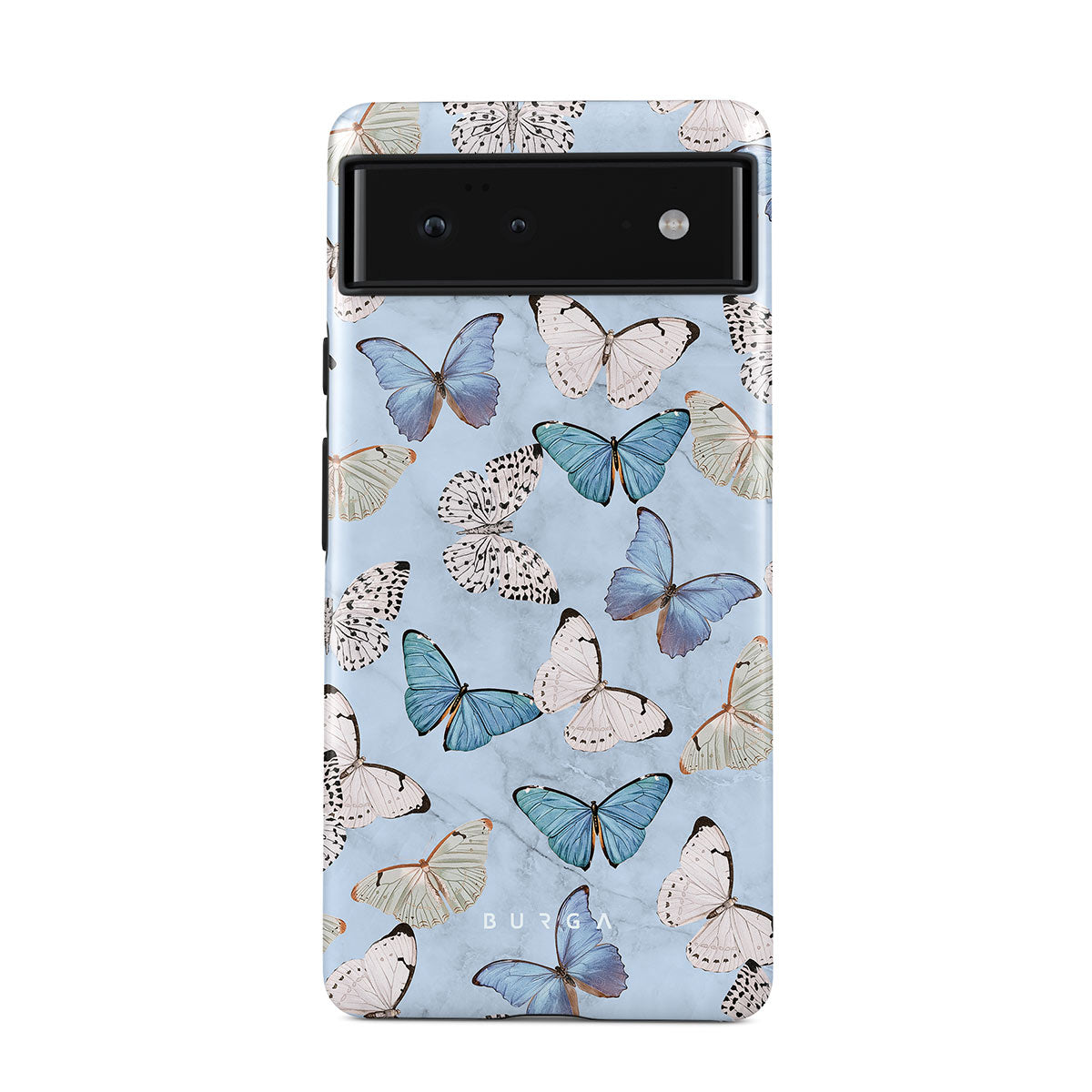 Pastel blue and a playful pattern of summery butterflies create a dreamy combination in our Samsung Galaxy S22 phone case. Carry the feeling of the butterflies in your stomach while protecting your phone from any dangers, as the hard-shell case will keep it sound and safe.