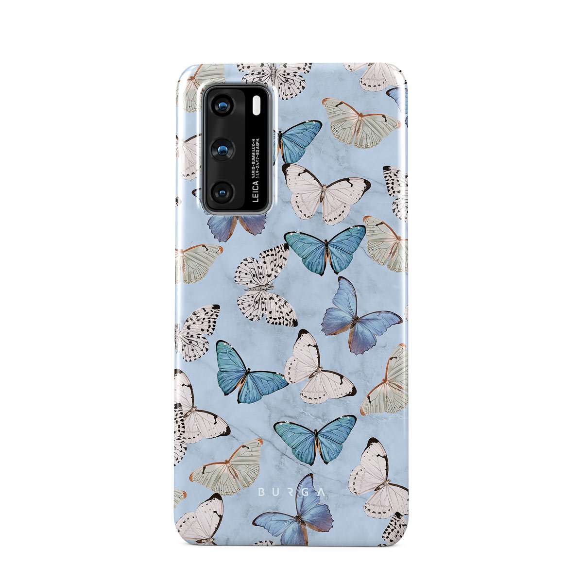 Pastel blue and a playful pattern of summery butterflies create a dreamy combination in our Huawei P40 phone case. Carry the feeling of the butterflies in your stomach while protecting your phone from any dangers, as the hard-shell case will keep it sound and safe.