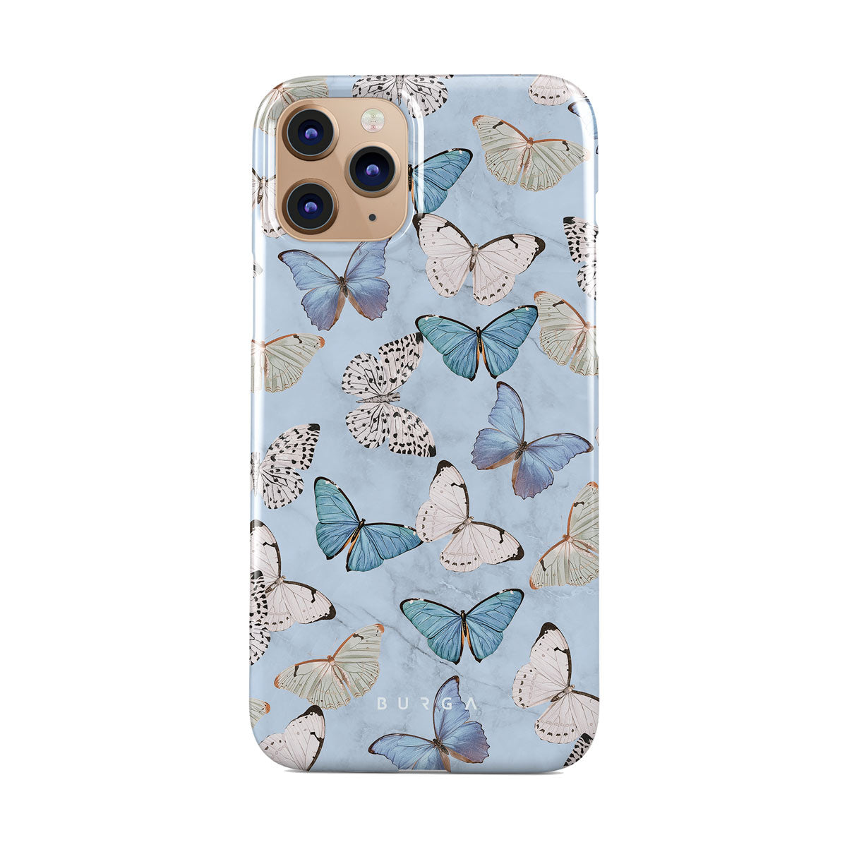 Pastel blue and a playful pattern of summery butterflies create a dreamy combination in our iPhone 11 Pro Max phone case. Carry the feeling of the butterflies in your stomach while protecting your phone from any dangers, as the hard-shell case will keep it sound and safe.
