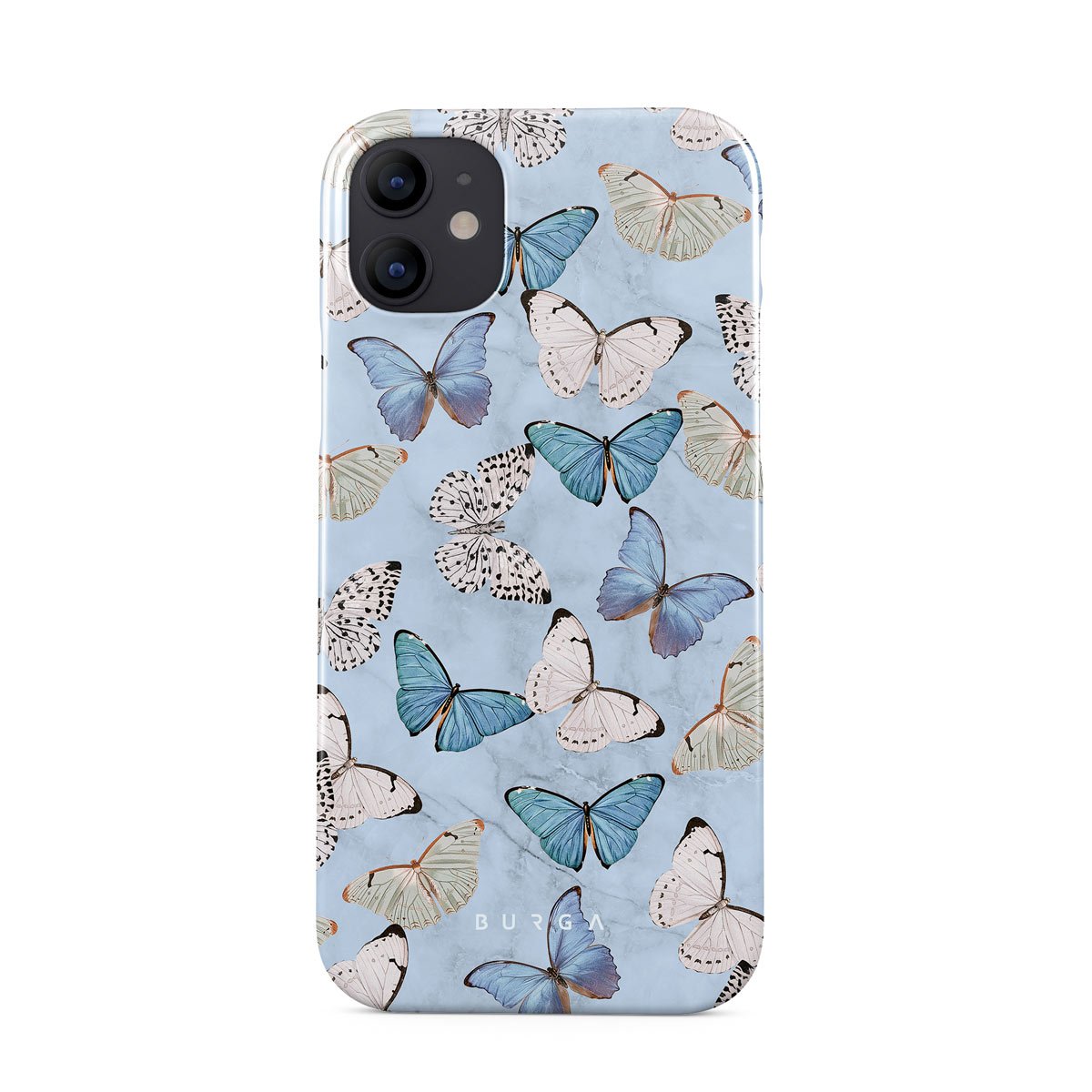 Pastel blue and a playful pattern of summery butterflies create a dreamy combination in our iPhone 12 Mini phone case. Carry the feeling of the butterflies in your stomach while protecting your phone from any dangers, as the hard-shell case will keep it sound and safe.