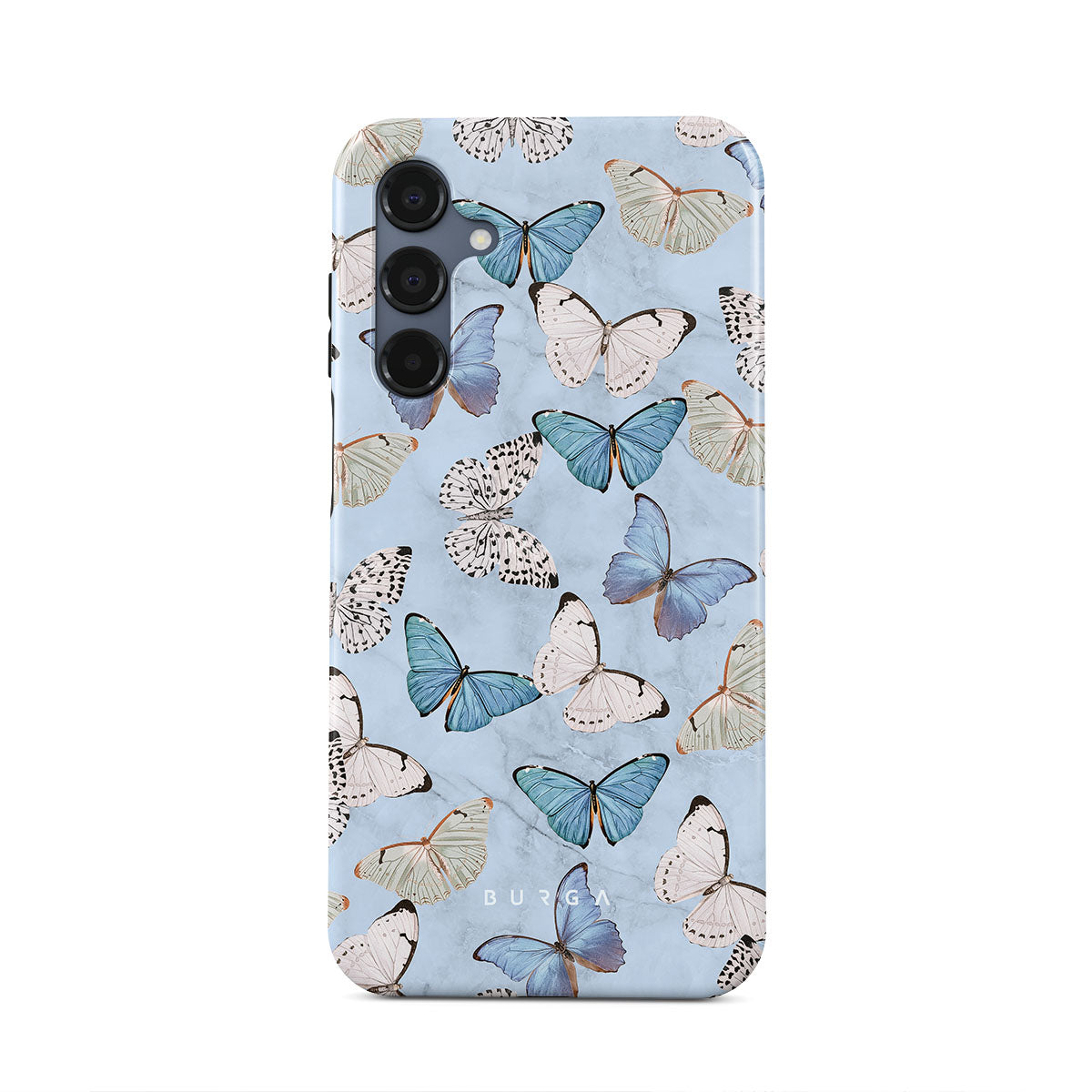 Pastel blue and a playful pattern of summery butterflies create a dreamy combination in our Samsung Galaxy A16 phone case. Carry the feeling of the butterflies in your stomach while protecting your phone from any dangers, as the hard-shell case will keep it sound and safe.
