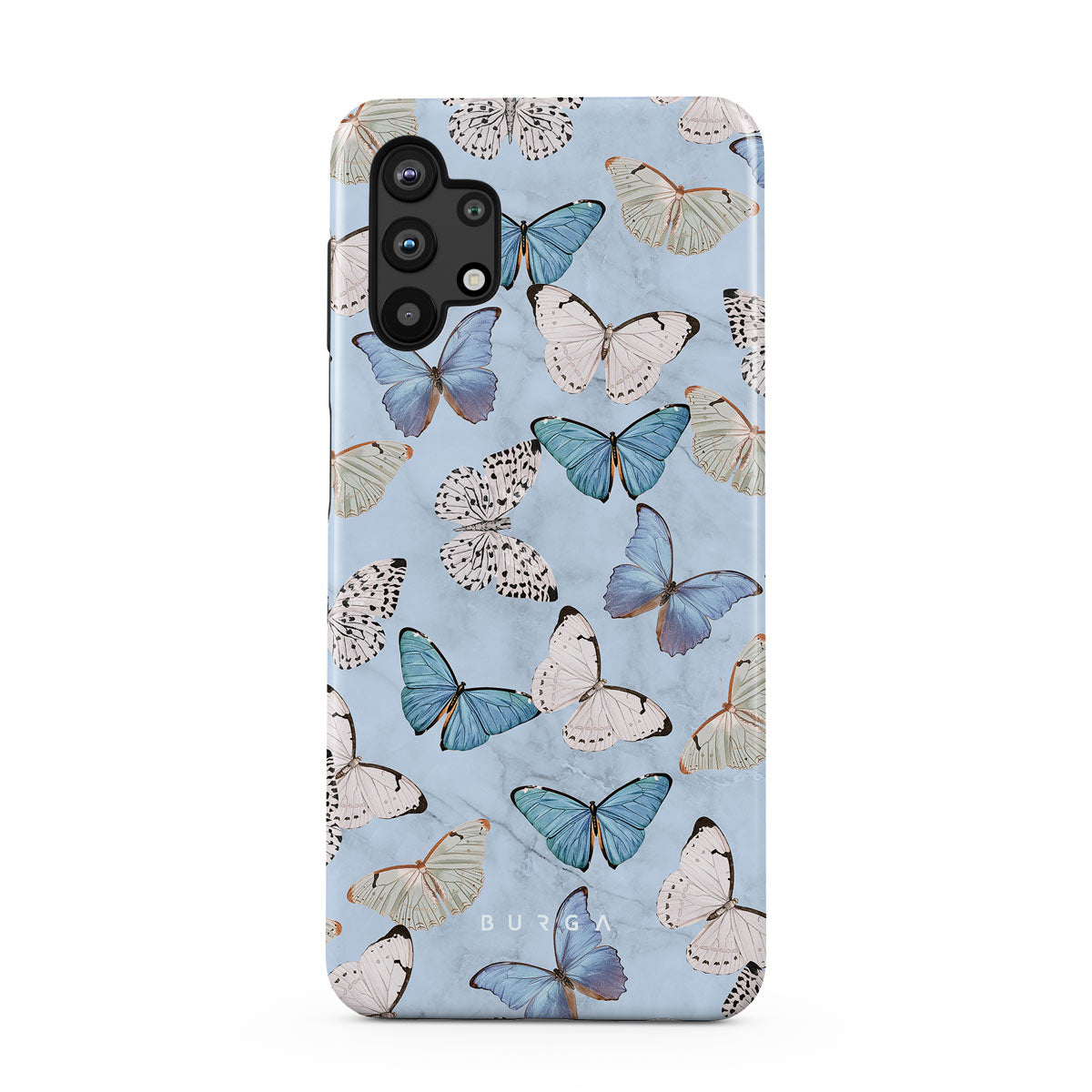 Pastel blue and a playful pattern of summery butterflies create a dreamy combination in our Samsung Galaxy A32 5G phone case. Carry the feeling of the butterflies in your stomach while protecting your phone from any dangers, as the hard-shell case will keep it sound and safe.