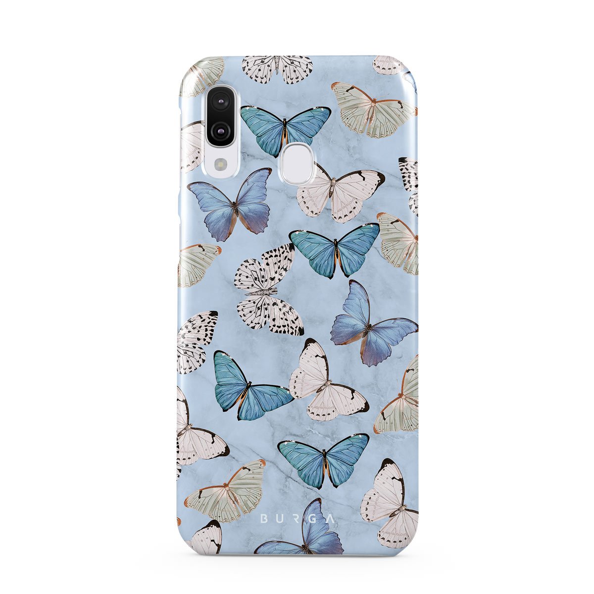 Pastel blue and a playful pattern of summery butterflies create a dreamy combination in our Samsung Galaxy A40 phone case. Carry the feeling of the butterflies in your stomach while protecting your phone from any dangers, as the hard-shell case will keep it sound and safe.