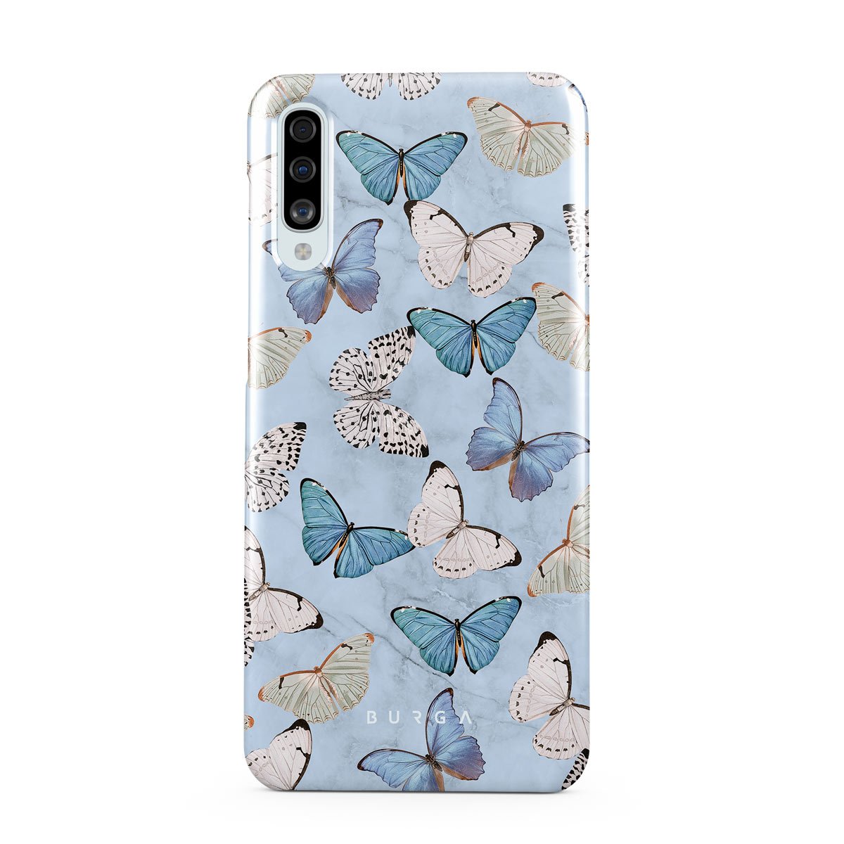 Pastel blue and a playful pattern of summery butterflies create a dreamy combination in our Samsung Galaxy A50 phone case. Carry the feeling of the butterflies in your stomach while protecting your phone from any dangers, as the hard-shell case will keep it sound and safe.