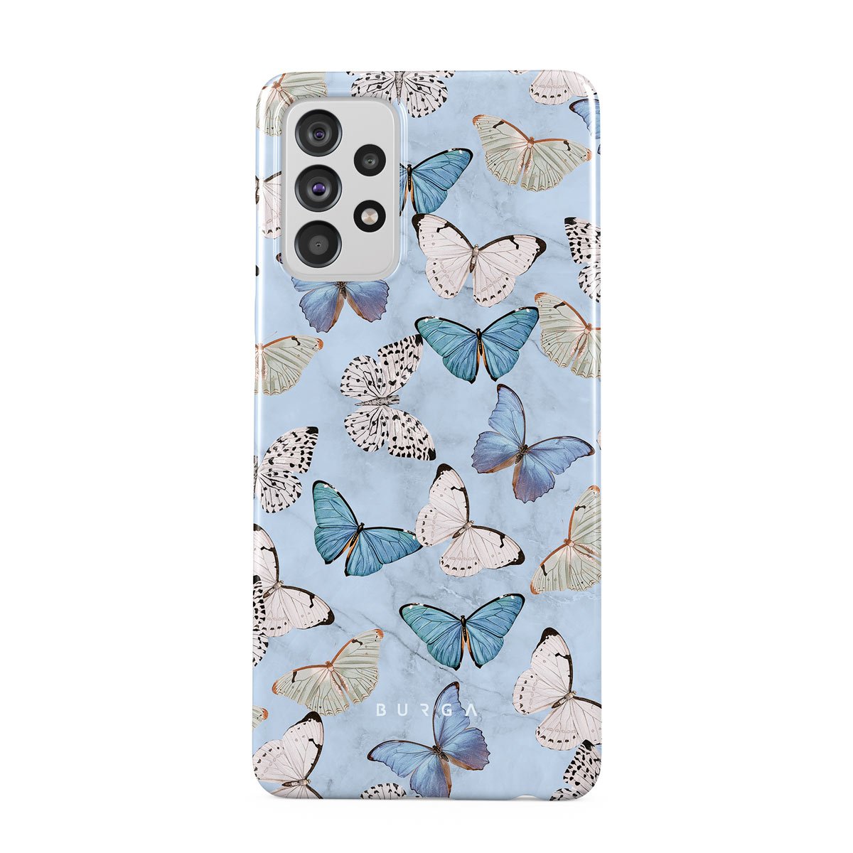 Pastel blue and a playful pattern of summery butterflies create a dreamy combination in our Samsung Galaxy A72 phone case. Carry the feeling of the butterflies in your stomach while protecting your phone from any dangers, as the hard-shell case will keep it sound and safe.