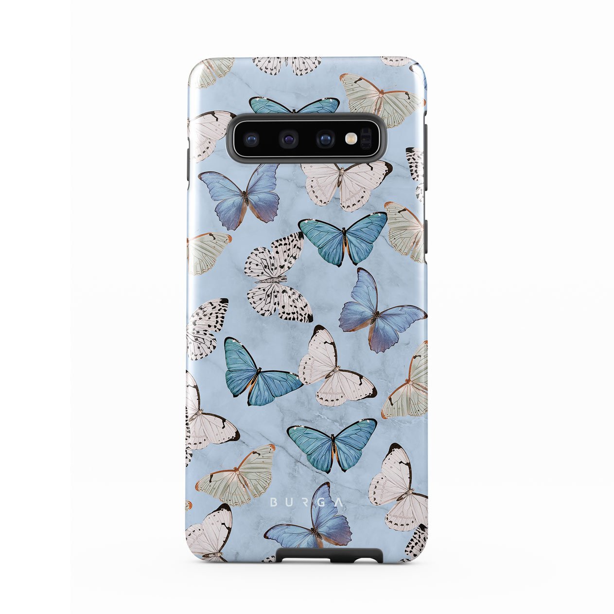 Pastel blue and a playful pattern of summery butterflies create a dreamy combination in our Samsung Galaxy S10 phone case. Carry the feeling of the butterflies in your stomach while protecting your phone from any dangers, as the hard-shell case will keep it sound and safe.