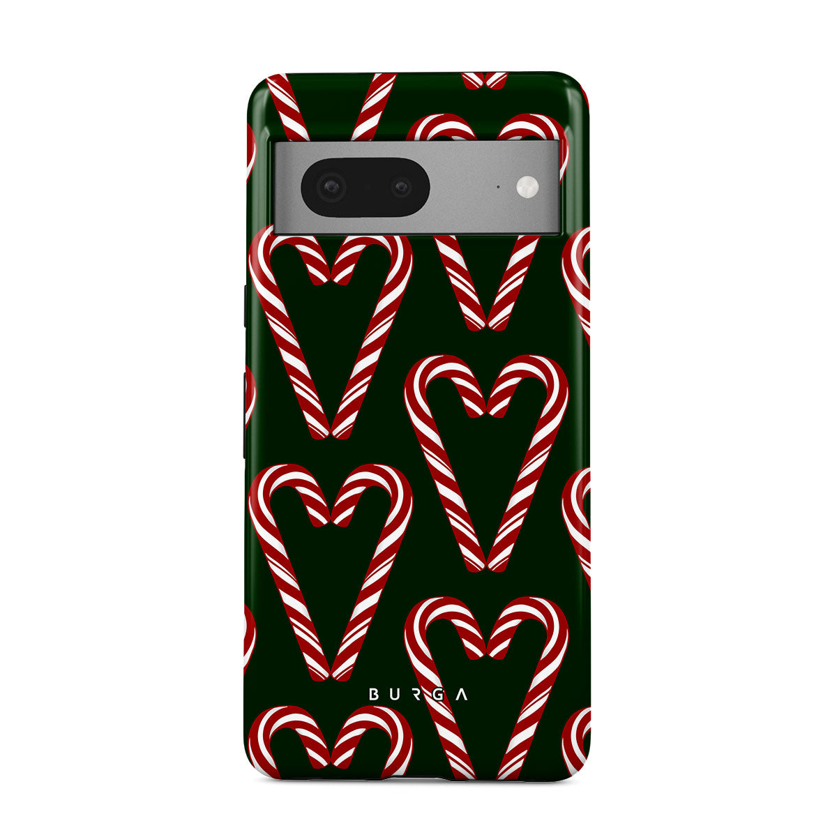 Vibrant and playful, our Candy Cane Google Pixel 7a Case phone case design showcases candy cane heart motifs against a dark green background—a delightful choice for those who love a touch of whimsy and nostalgia.